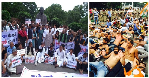 లలిత్ మోడీ వ్యవహారంలో విదేశాంగ మంత్రి సుష్మా స్వరాజ్, రాజస్థాన్ ముఖ్యమంత్రి వసుందర రాజే, వ్యాపం కుంభకోణంలో మధ్యప్రదేశ్ ముఖ్యమంత్రి శివరాజ్ సింగ్ చౌహాన్ రాజినామాలకి పట్టుబడుతూ.....